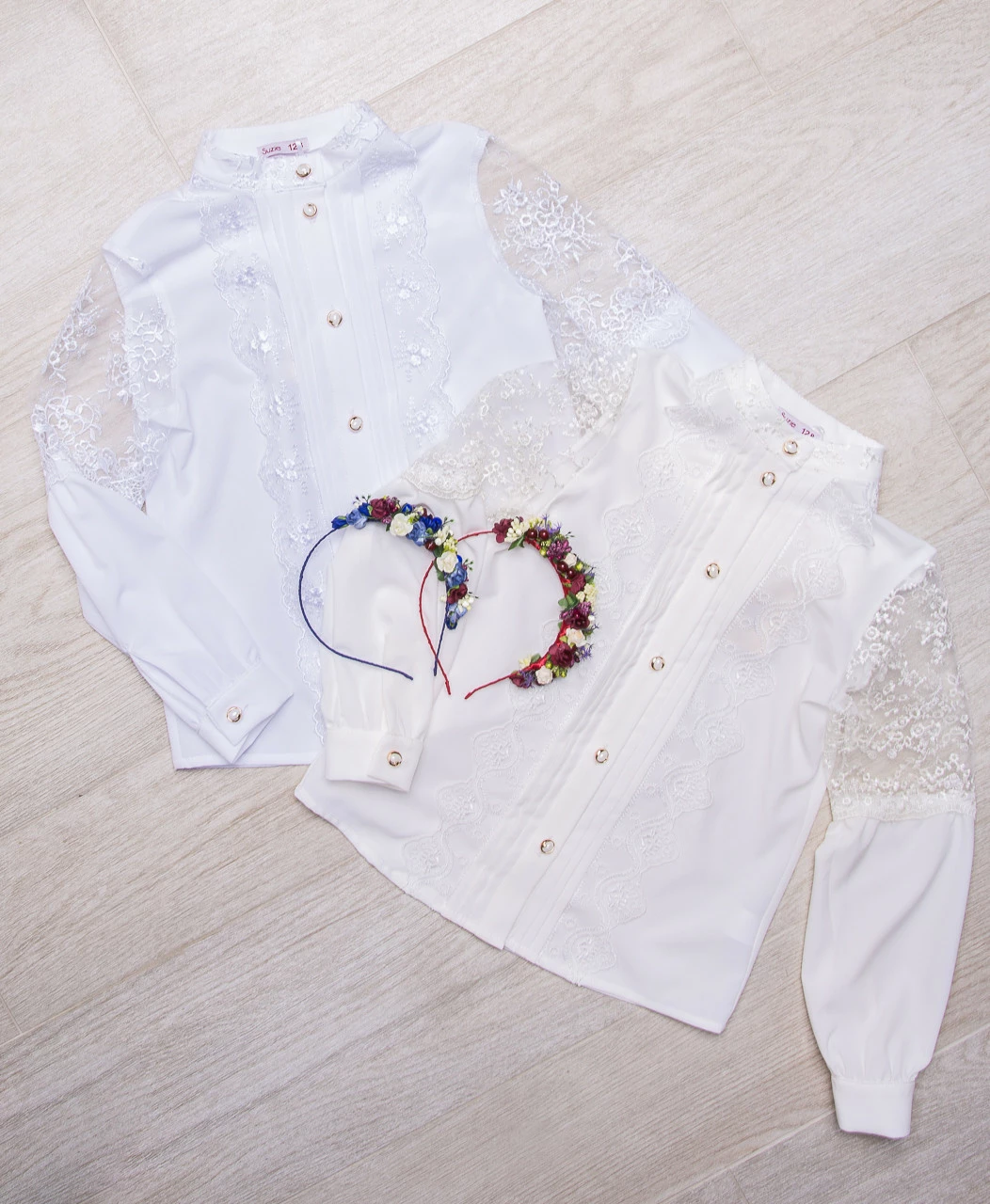 Школьная блуза Глори для девочки украшена нежным кружевом и пуговицами впереди.