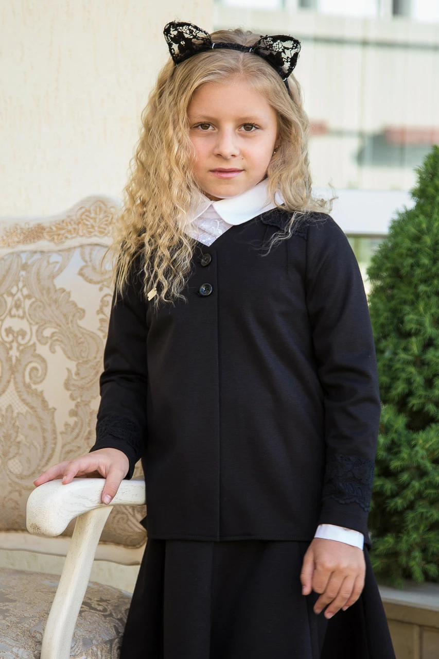 Стильный и элегантный черный пиджак Ирен для девочки с красивой вышивкой.