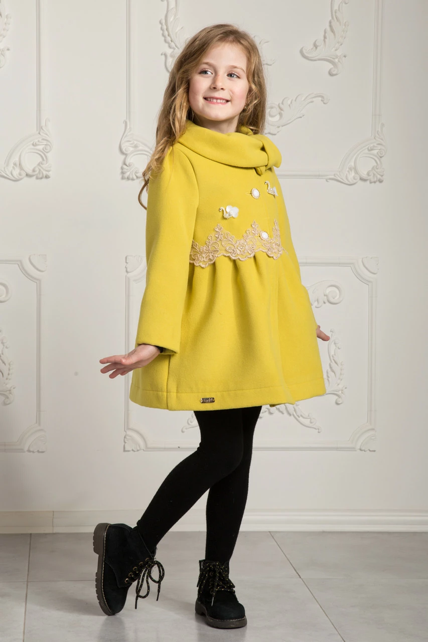 Модное кашемировое пальто Изольда с кружевом для девочки Suzie горчица р.110-122