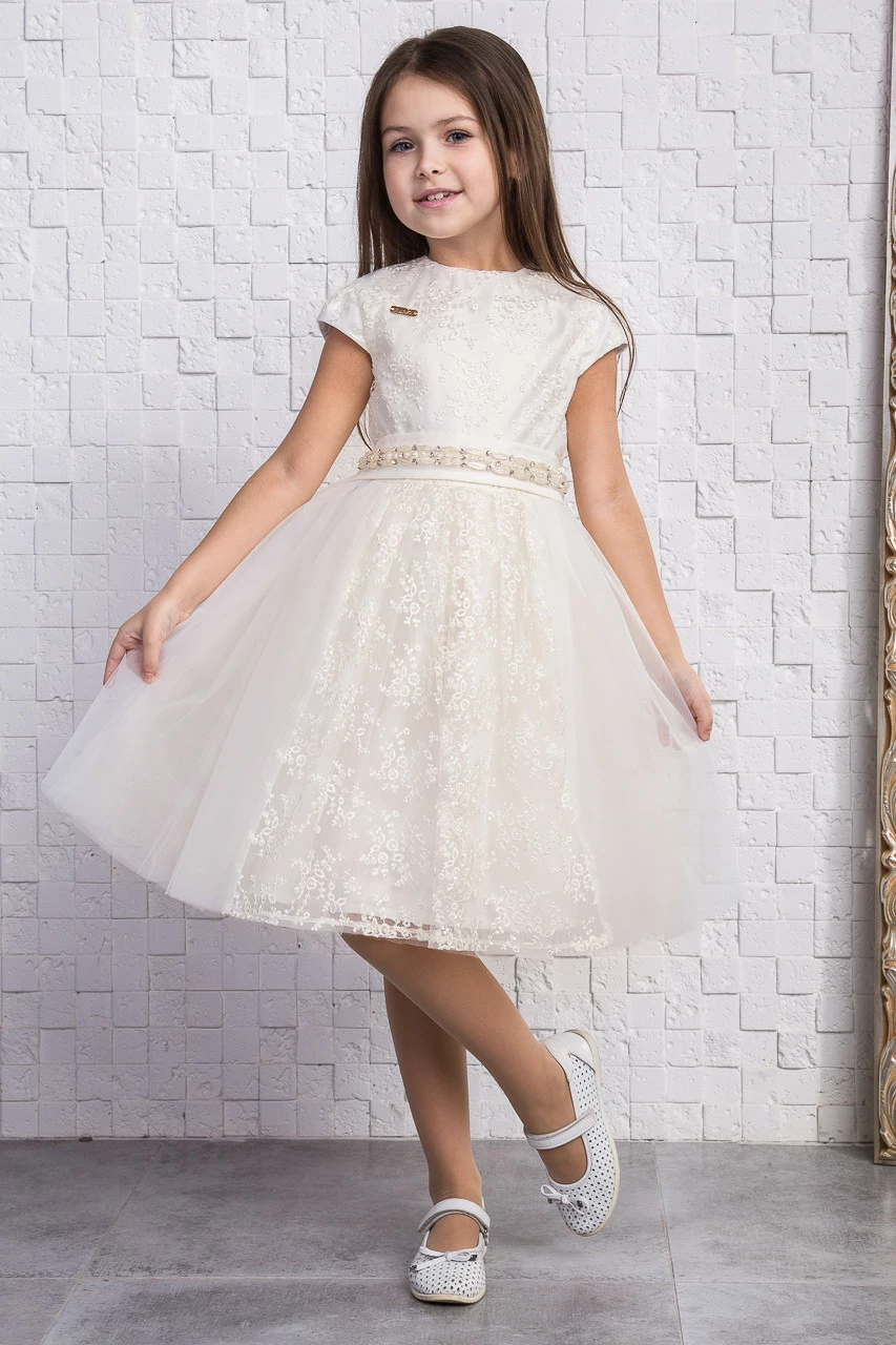 Нежный, изящный, гипюровый узор украшает верх платья и часть юбки.