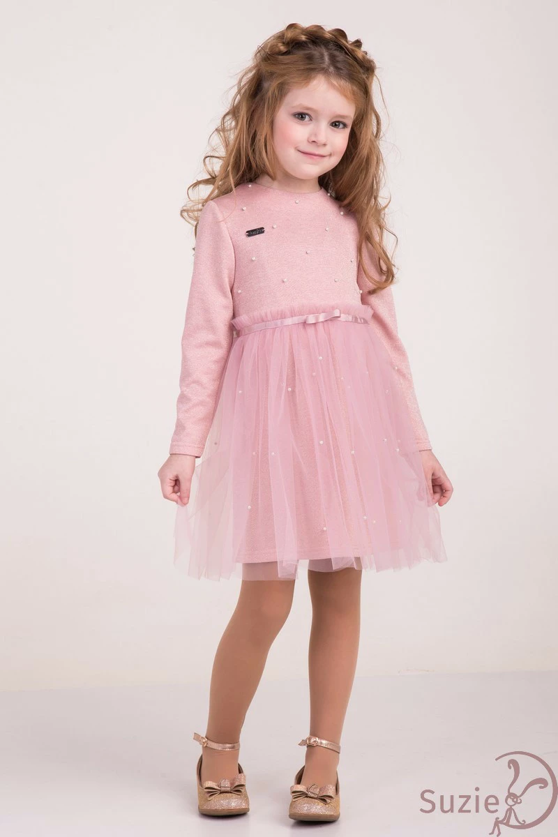 Платье выполнено из мягкой трикотажной ткани с люрексом, украшено бисером по всей длине. Юбка платья из материала евротюль, талия подчеркнута атласной ленточкой в цвет платья.