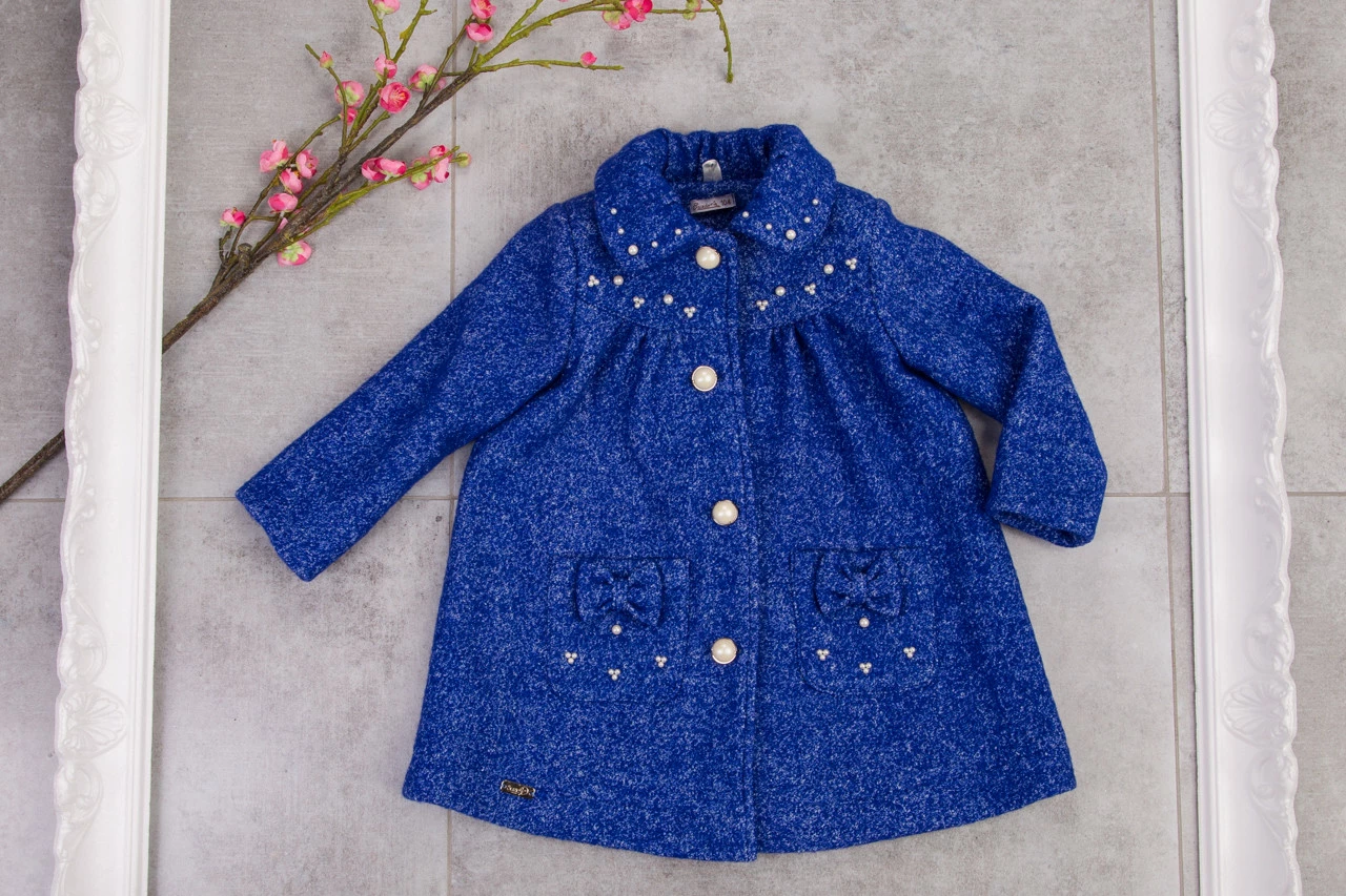 Нежное пальто силуэта трапеция - настоящая находка для совершенного образа Вашей малышки. Миловидное и изысканное в то же время комфортное для активных и энергичных девочек. Модель из теплого и качественного кашемира-букле, очень приятного на ощупь и гипоаллергенного. Полочки изделия формирует кокетка, и нижняя  часть со сборками. Особым конструктивным украшением стали складки отложного воротника, а миловидные кармашки с бантиками изыскано дополняют всю композицию изделия. Центральная застёжка на кокетке в виде пуговиц, от кокетки потайные кнопки для комфорта и защиты. Спинка с кокеткой, рукав прямой вшивной. Изюминкой новинки стал декор воротника, кокеток и карманов перламутровым жемчугом.