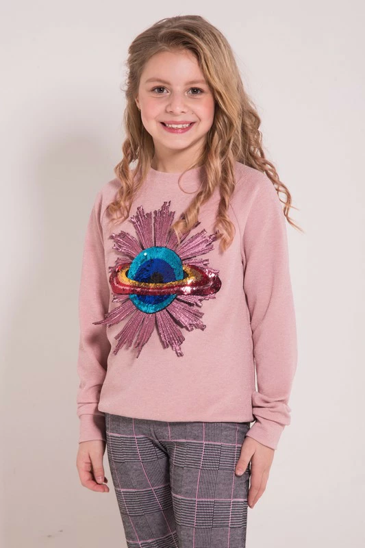 Яркая модная кофта Искра с рисунком планета для девочки Suzie. Цвет пудра р.128-158